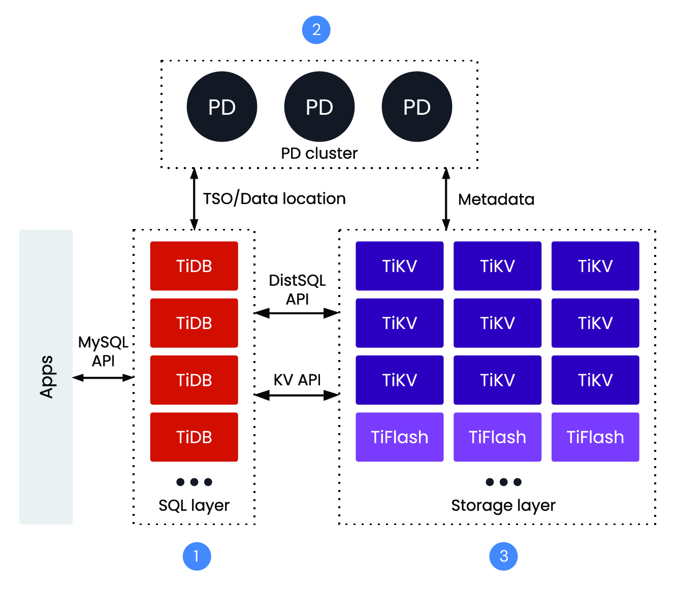 - 1. TiDB Server:ステートレスなSQLレイヤーで、MySQLと互換性があり、コンピュートとストレージを分離することでスケーリングを容易にします。各ノードは読み取りと書き込みの両方を受け付けられます。