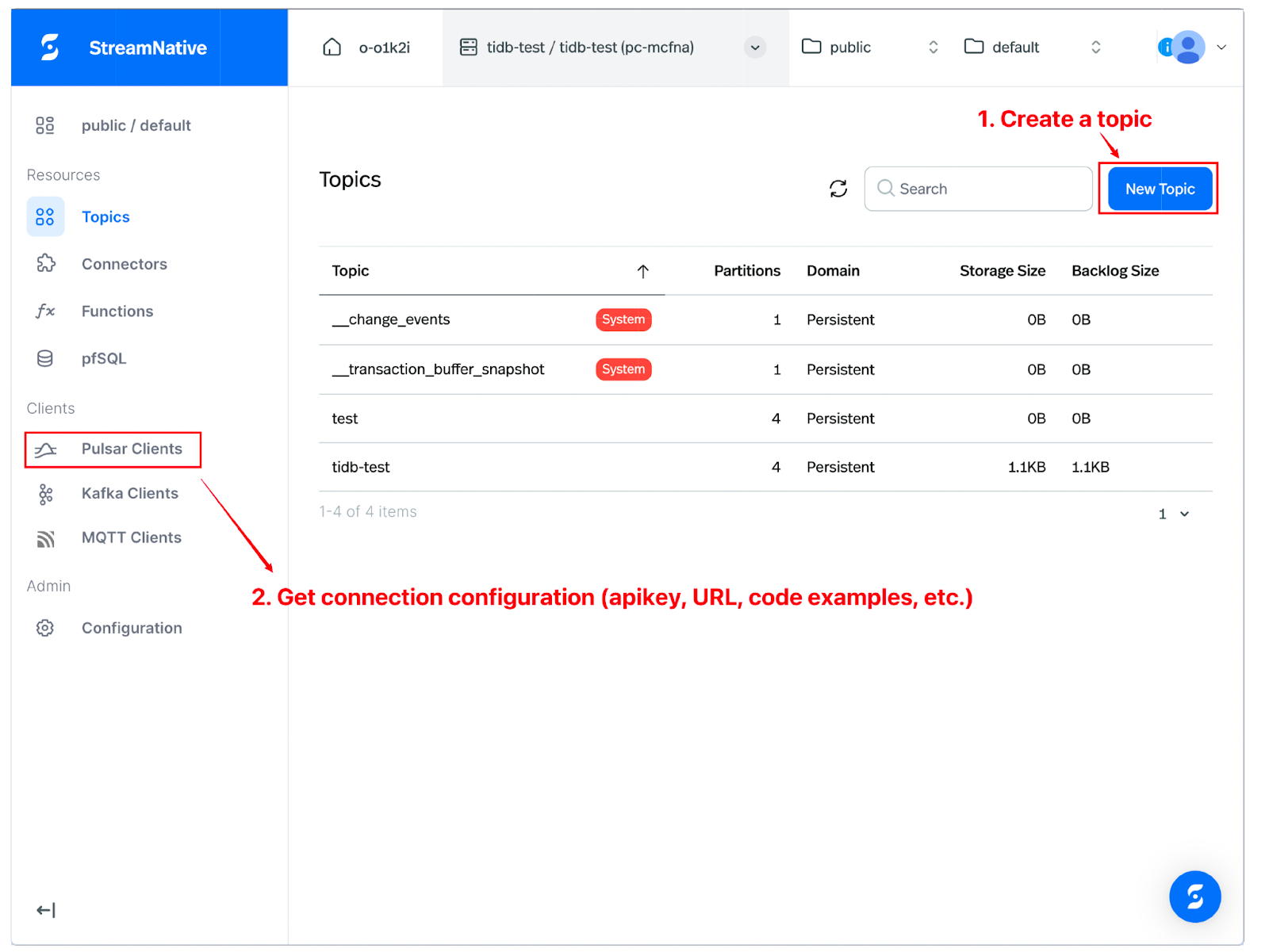 - トピックの作成:Topicsセクションに移動し、目的のテナントとネームスペースを選択して、新しいトピック (例:tidb-changes) を作成します。後で必要になるため、トピック名を控えてください。