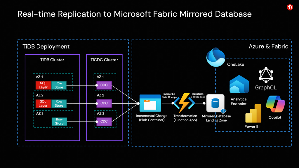 TiDBは、クラウドネイティブ、データ集約型、およびAI駆動型アプリケーション向けに構築されたオープンソースの分散型SQLデータベースです。MySQLと互換性があり、水平スケーラビリティ、強力な一貫性、および高可用性を特徴としています。Open MirroringのためのTiCDCレプリケーションソリューションを活用することで、TiDBは Microsoft Fabricとシームレスに統合されます。これにより、あらゆるTiDBデプロイメント環境から Microsoft Fabric OneLakeへの継続的なリアルタイムデータ同期が可能となり、AIおよび分析のためにデータが即座に利用可能になります。