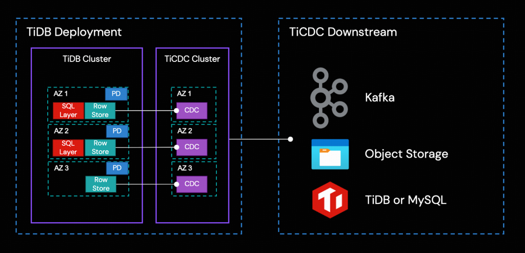 TiCDC (TiDB Change Data Capture) は、TiDBクラスタから行レベルのデータ変更を捕捉し、それをリアルタイムでダウンストリームプラットフォームに出力する、TiDBのコアコンポーネントです。TiDB CloudとTiDB Self-ManagedクラスタのどちらでもTiCDCを有効にできます。