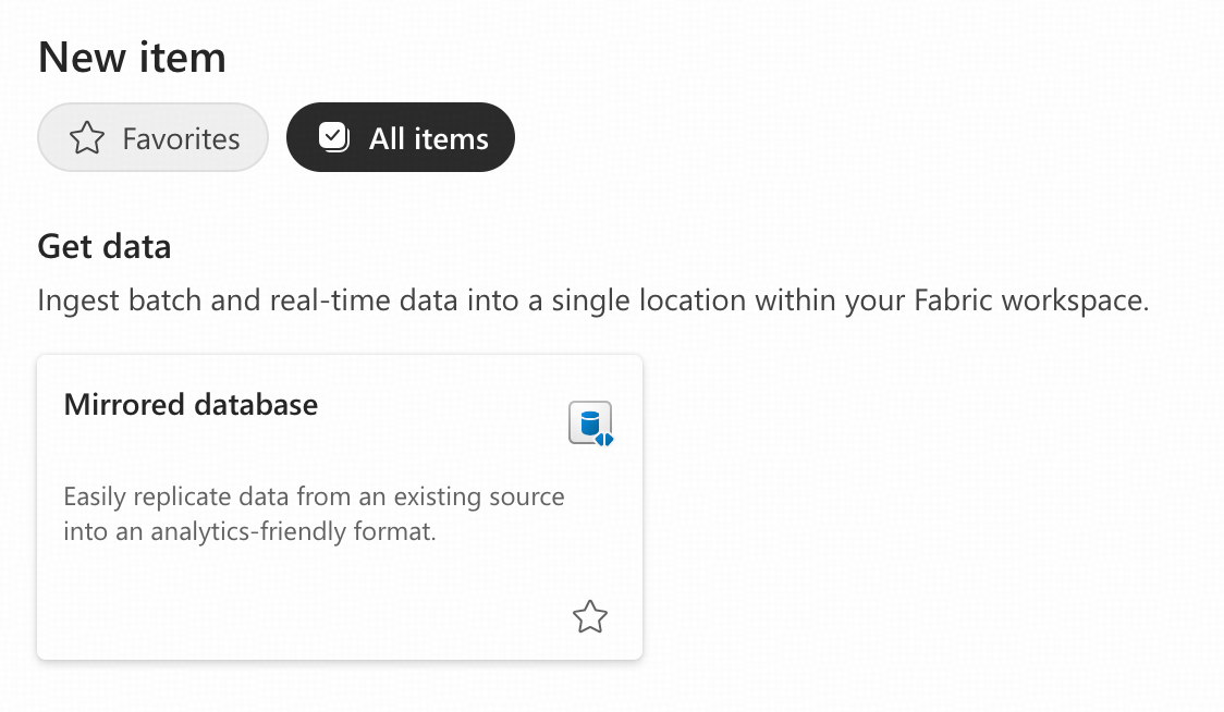 - ワークスペース内で、「+ New item」をクリックし、Mirrored databaseアイテムを選択します。