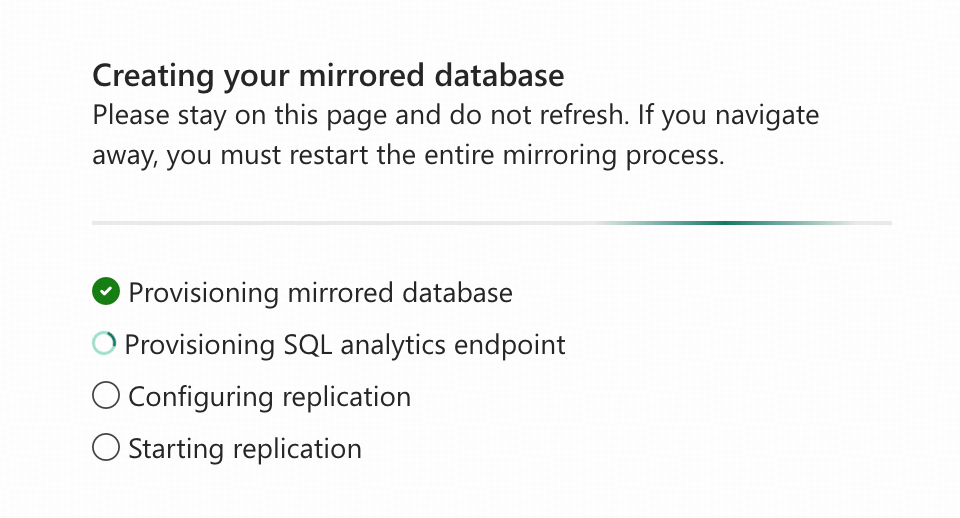 これでMirrored Databaseはソースデータベースと同じデータを持つ状態になりましたが、リアルタイムのChangefeedはまだ有効になっていません。