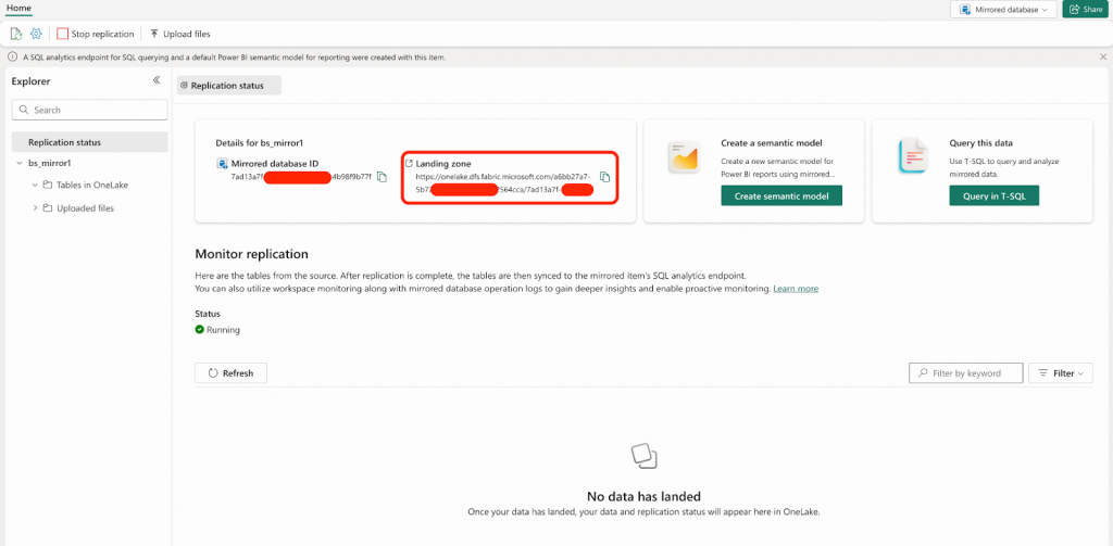 - Mirrored Databaseが作成され、レプリケーションが自動的に開始された後、この画面が表示されます。Landing Zone URLをコピーして、今後のために保存しておく必要があります。以降の手順では、このLanding Zone URLを<landing_zone_url>というプレースホルダーで表記します。