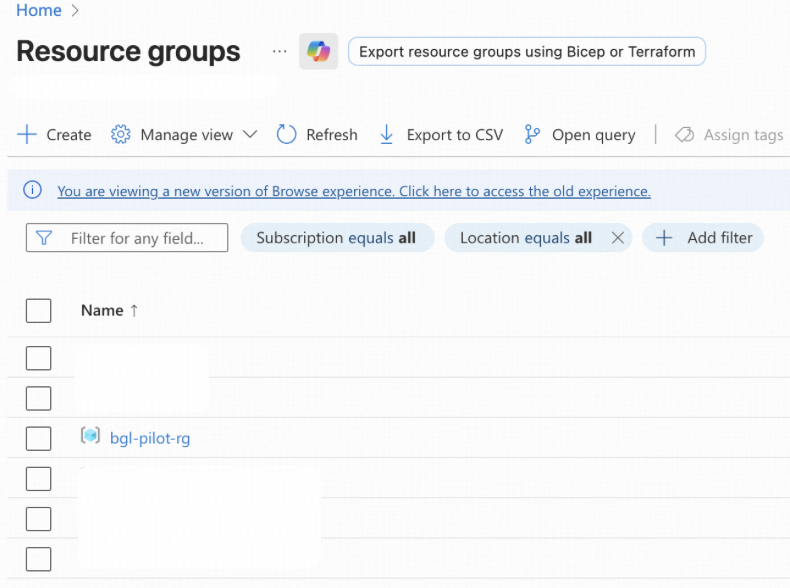 - 他のステップで作成される新しいAzureリソースはすべて、リソースグループbgl-pilot-rgに配置されます。