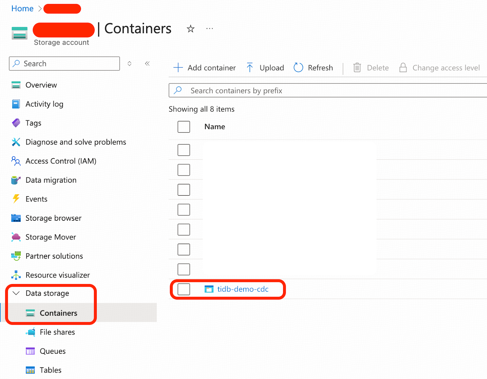 - 作成したストレージアカウント内で、この例のためにtidb-demo-cdcという名前の新しいBlobコンテナーを作成します。