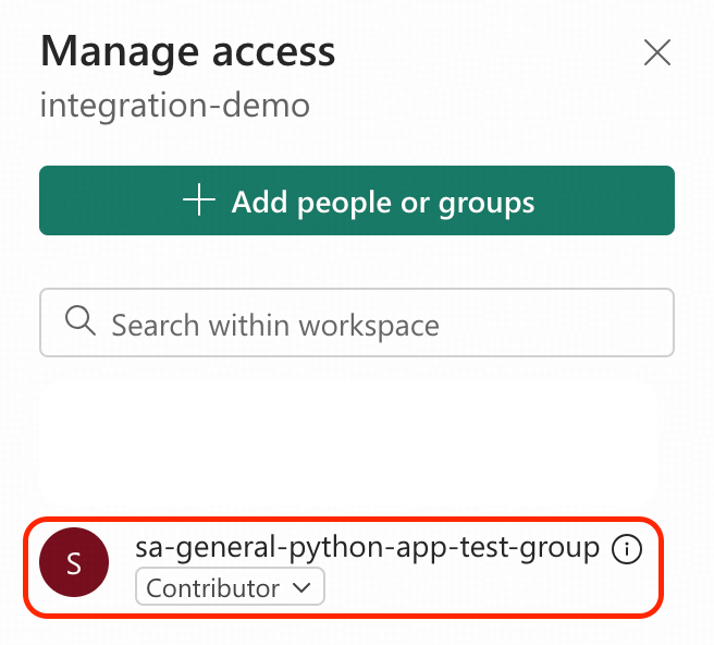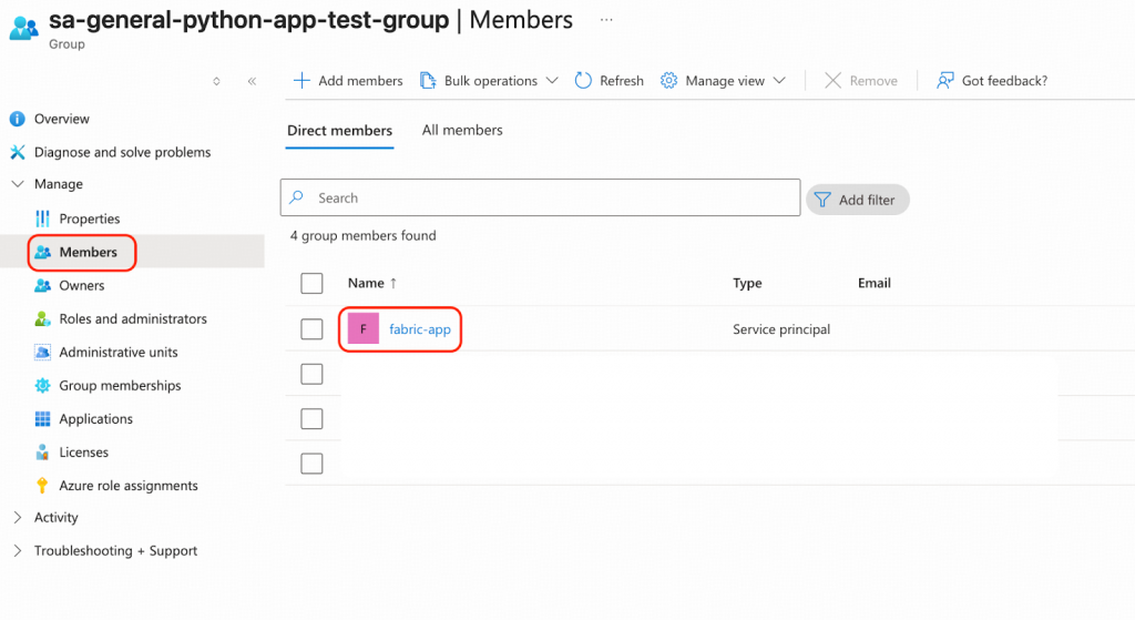 登録アプリケーションfabric-appをEntra IDグループに追加します。この例でのグループ名はsa-general-python-app-test-groupです。