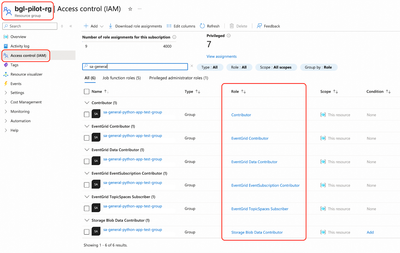 - Azureポータルからsa-general-python-app-test-groupにアクセス許可を付与します。リソースグループに移動しbgl-pilot-rgをクリックし、アクセス制御 (IAM) をクリックします。「+ Add」をクリックし、続いて「Add role assignment」をクリックします。以下のロールが推奨されます。