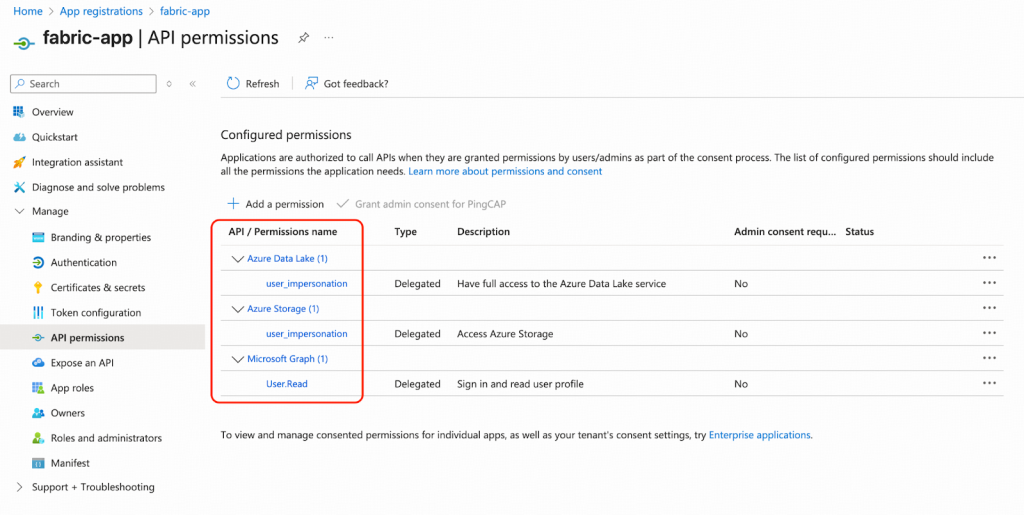 - Azureポータルからfabric-appにアクセス許可を付与します。App registratoionsに移動し、API permissionsの下にあるfabric-appをクリックします。以下のアクセス許可が推奨されます。