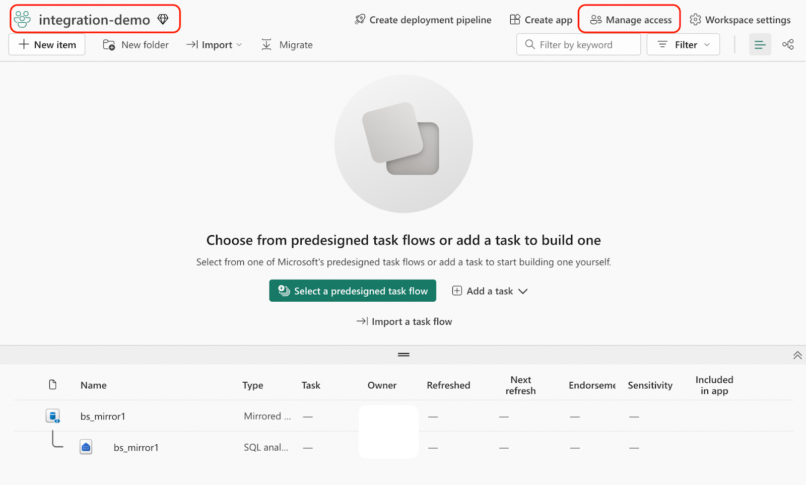 - ワークスペースintegration-demoに移動し、Manage accessをクリックします。