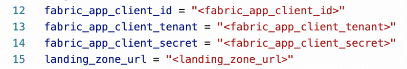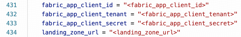 - Pythonスクリプトopenmirroring_admin_solution.pyの430行目付近を修正し、以下のプレースホルダーを、ステップ1およびステップ4でコピーした実際の値に置き換えてください。
