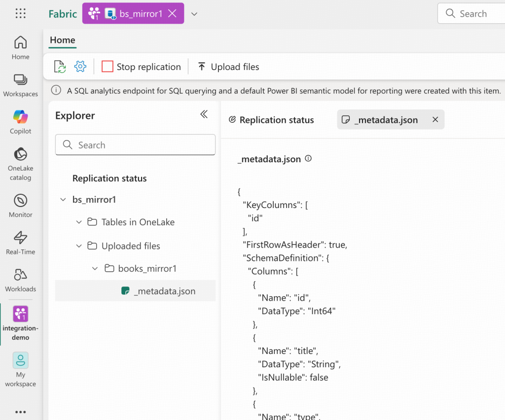 - ワークスペースintegration-demoに移動し、bs_mirror1 Mirrored Databaseを開いて、「Uploaded files」セクションを展開します。_metadata.jsonファイルが存在することを確認してください。OneLakeはこのメタデータを使用して、非同期的にDelta Tableを作成します。