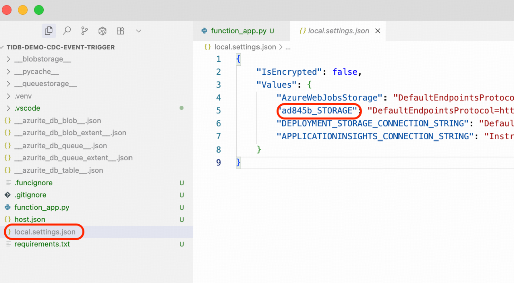 - 次に、Pythonスクリプトfunction_app.pyの403行目付近を修正し、プレースホルダーである<connection_name>を実際の接続名に置き換えてください。この値は、あなたのlocal_settings.jsonファイル内で見つけることができます。その形式はxxxxxx_STORAGEのようなものです。