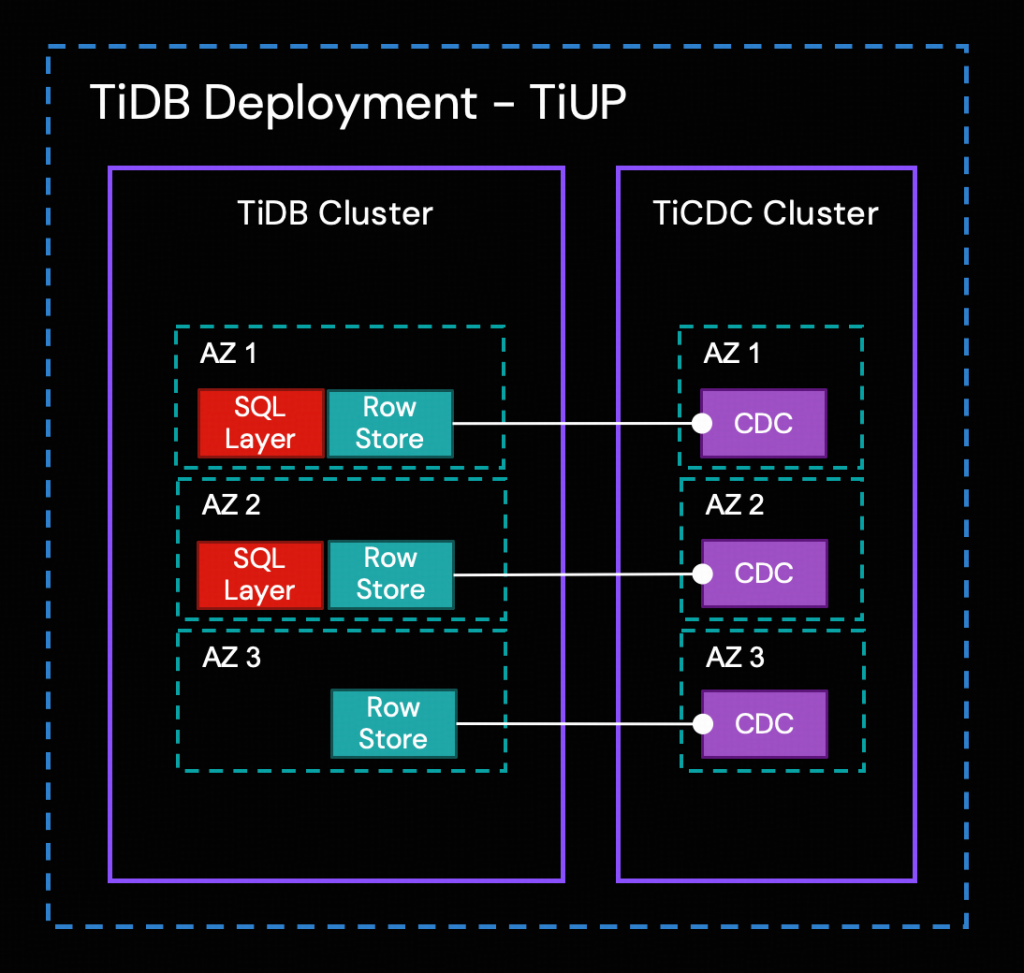 高可用性のため、この例では、TiDBクラスタの構成に合わせてTiCDCクラスタを3つのアベイラビリティゾーンにまたがってデプロイします。これは顧客のニーズに合わせて調整可能ですが、単一ノードでも機能するものの、本番環境では複数のノードをゾーンをまたいで配置することが推奨されます。既存のTiDBクラスタは、オンプレミスでも、AWS、GCP、Azureなどのあらゆるクラウド環境に配置されていても構いません。