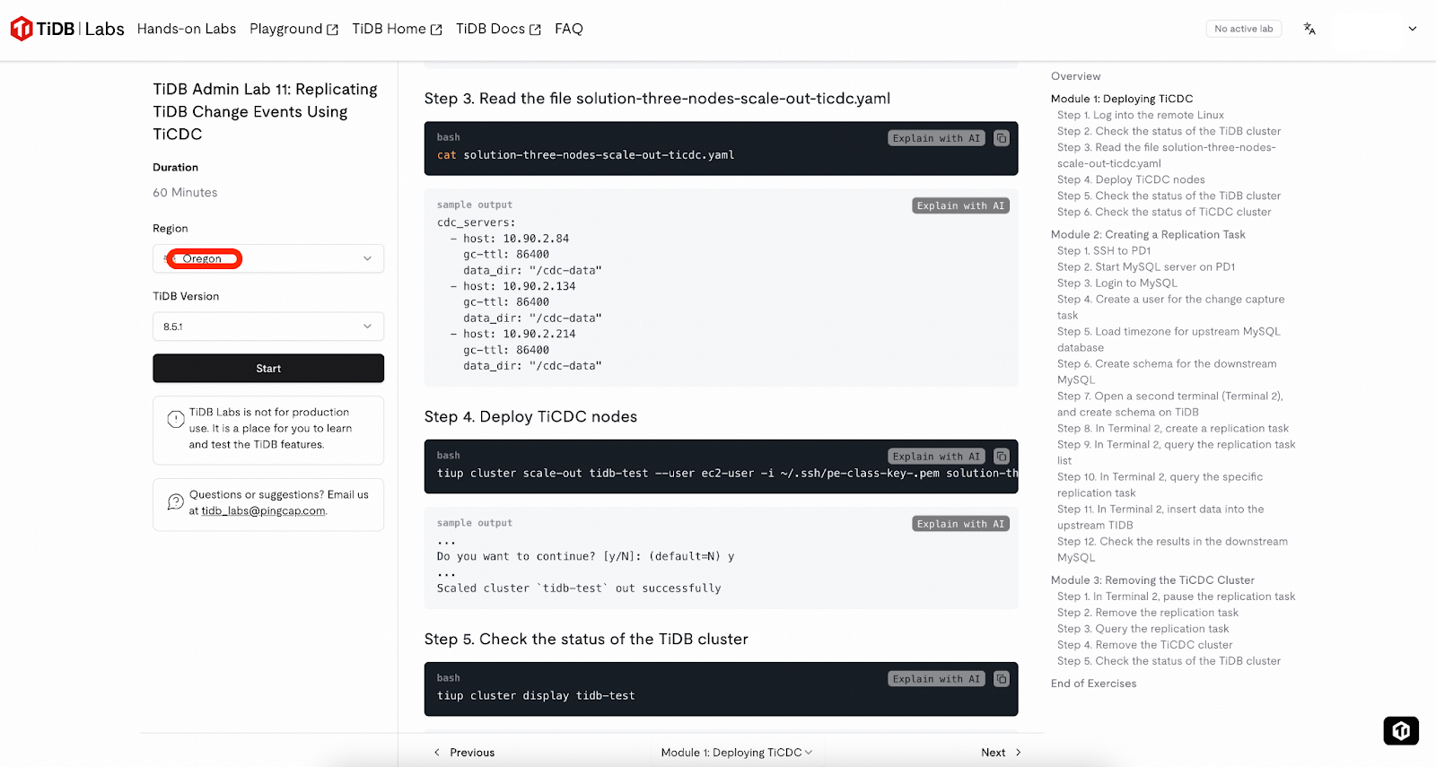 もしTiDBおよびTiCDCを初めてご利用になる場合、このステップのタスクは複雑に感じられるかもしれません。TiDB Labsが提供するサンドボックス環境 (1インスタンスあたり2時間) の利用をお勧めします。単にOregonリージョンを選択してラボを開始し、ガイダンスに従って