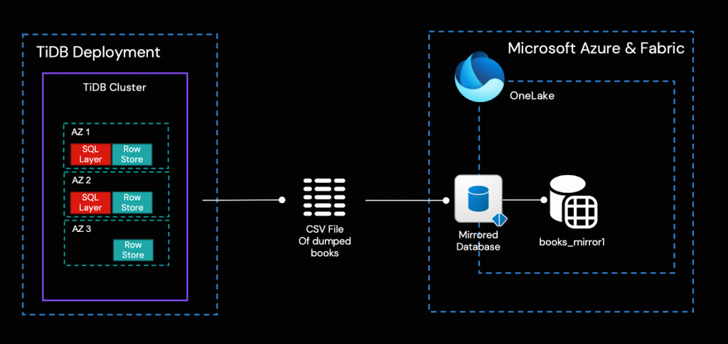 このステップでは、Dumplingを使用してTiDBからテーブルbooks全体をCSVファイルとしてダンプし、それをMirrored DatabaseのLanding Zoneにアップロードします。その後、FabricがデータをOneLakeへ自動的にプッシュします。