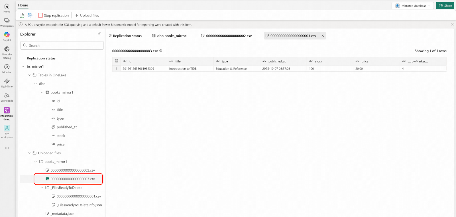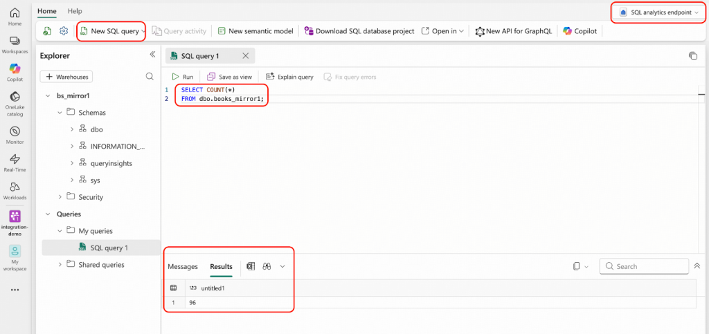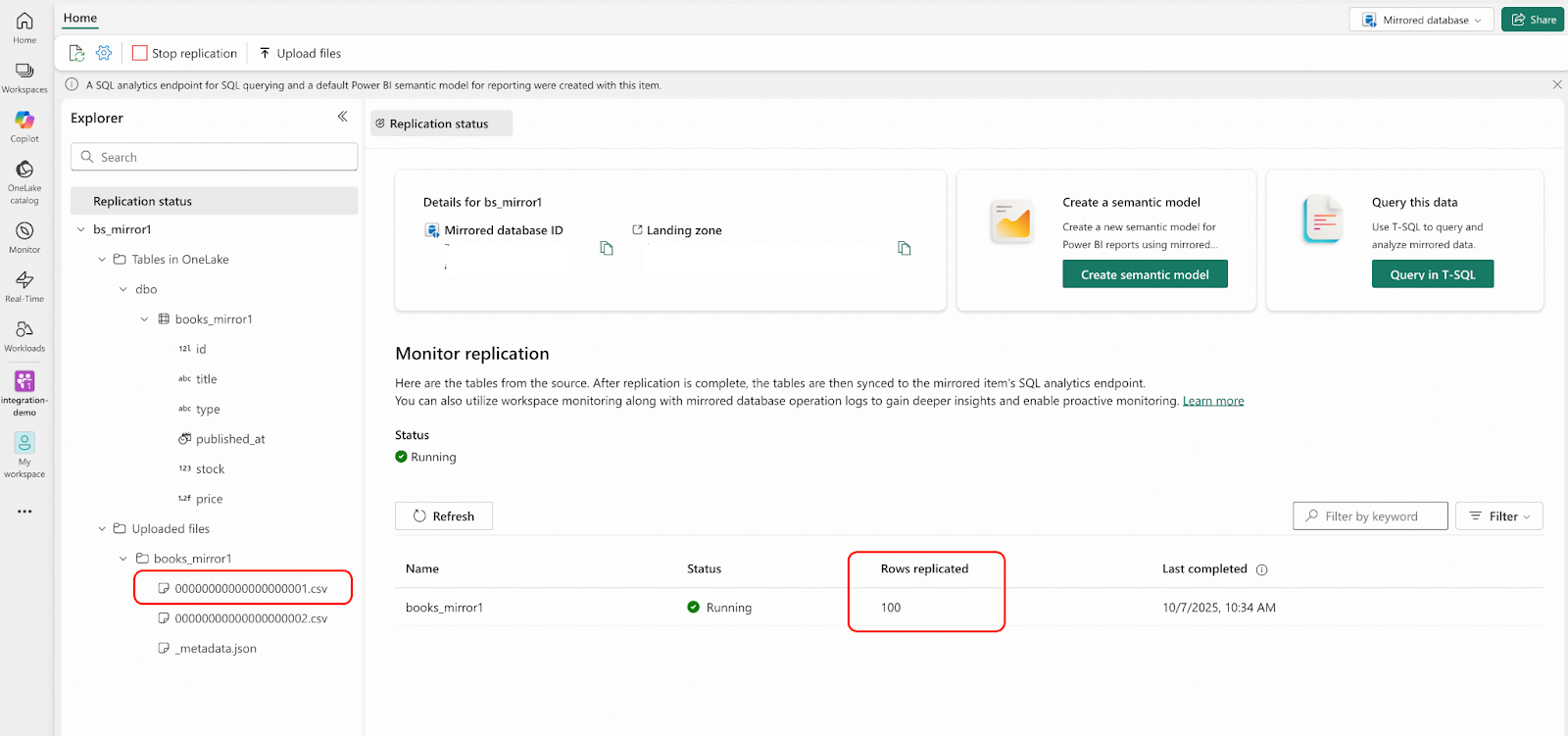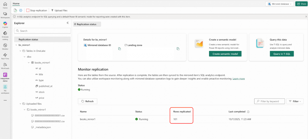 - Microsoft Fabricポータルで、integration-demoワークスペースに移動し、bs_mirror1 mirrored databaseを開いてください。以下のスクリーンショットで強調表示されている領域に示されているとおりに、結果を確認します。
