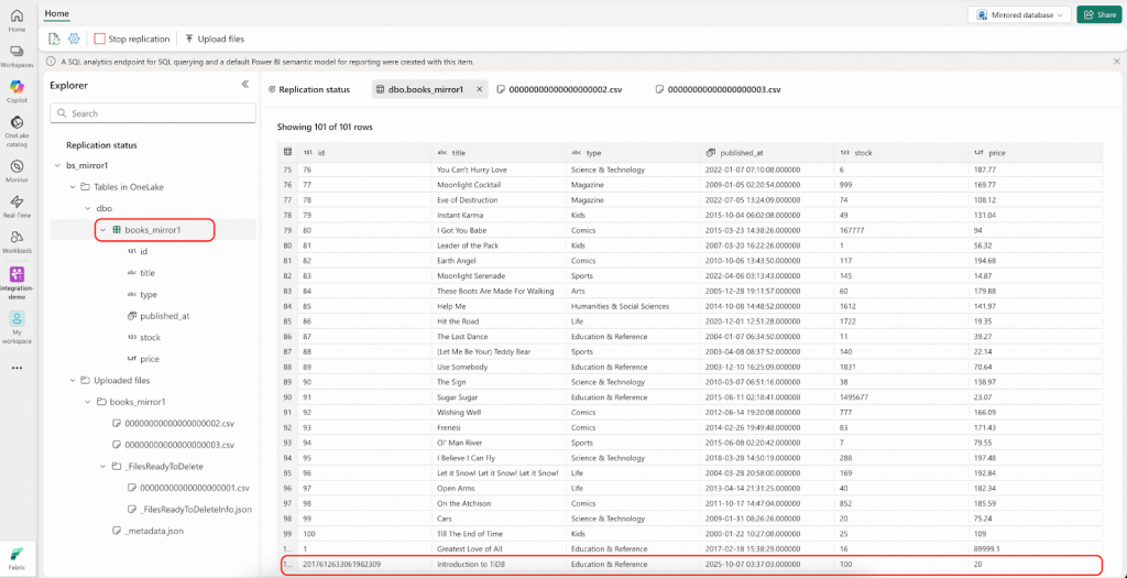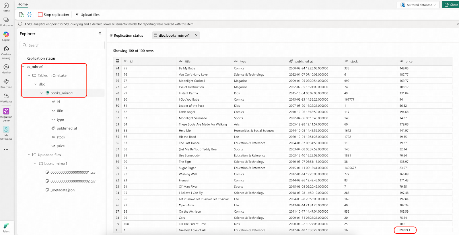 - 少し待って、「Rows replicated (複製された行)」のカウントが101に変わったら、IDが1の行を確認してください。OneLake内の価格は、bookshop.books.000000000.csvファイルの値の0.9倍になっているはずです。