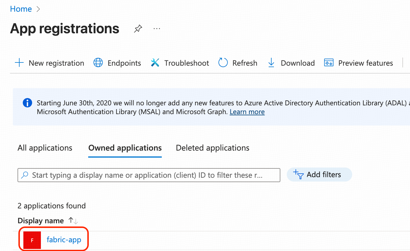 - App registrationsに移動します。「+ New registration」をクリックし、その他の設定はすべて既定値のままにして「Create」をクリックします。この例では、fabric-appという名前を付けます。