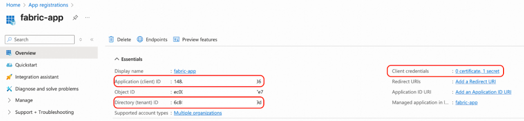 - ディレクトリ (テナント) IDを控えておきます。以降のステップでは、これを<fabric_app_client_tenant>と表記します。