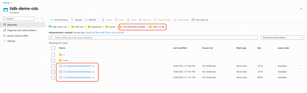 - Blobコンテナーのパスはtidb-demo-cdcです。