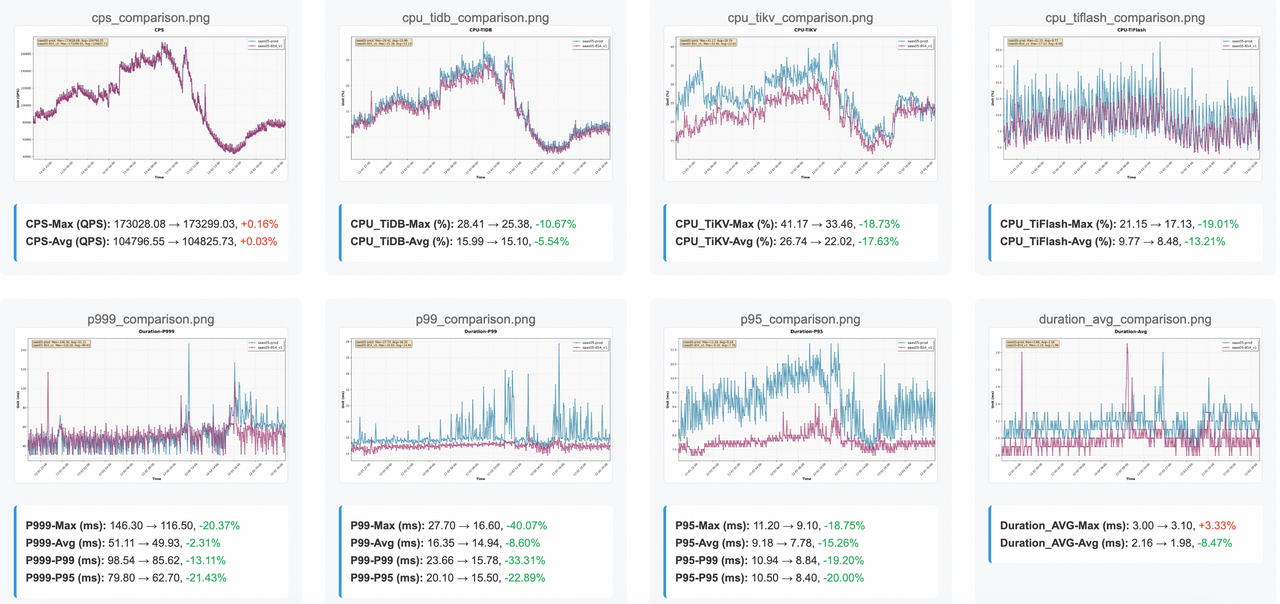 - CPU使用率:TiDB、TiKV、およびTiFlashのCPU使用率が10%以上減少しています。これにより、明確なパフォーマンスの向上、あるいはコスト削減の機会を確認できたことになります。