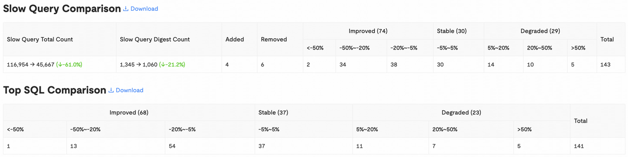 リプレイ完了後、TiDB Cloudは以下の項目に基づき、クラスタの健全性を効率的に比較するためのレポートを生成します。