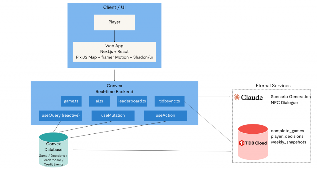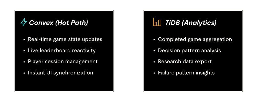 私たちは、B40 Life Simulatorを明確な関心の分離に基づいて設計しました。リアルタイムのゲームプレイにはConvexを、分析および調査データにはTiDBを使用しています。このアーキテクチャを採用することで、プレイヤー体験とデータインサイトの両方を最適化することが可能になりました。